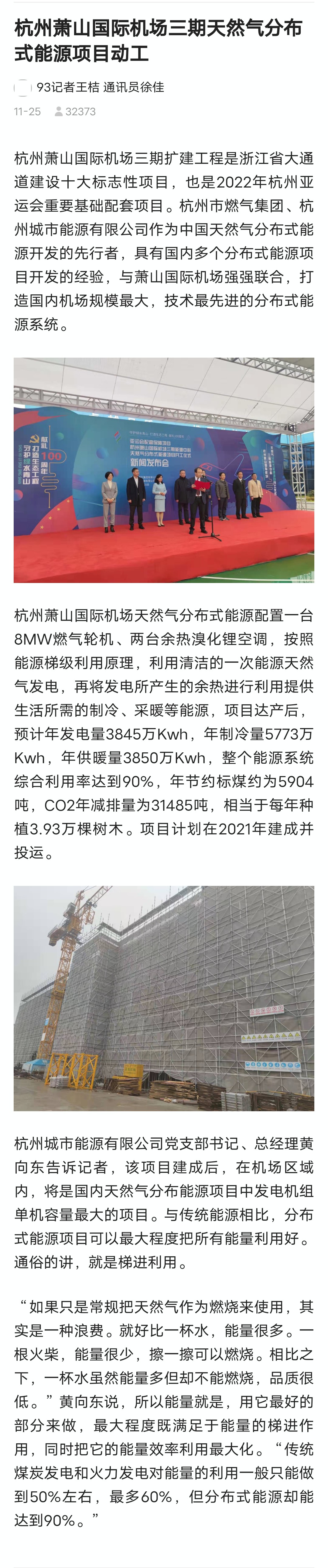 杭州城市能源有限公司党支部书记、总经理黄向东告诉记者,该项目建成后,在机场区域内,将是国内天然气分布能源项目中发电机组单机容量最大的项目。与传统能源相比,分布式能源项目可以最大程度把所有能量利用好。通俗的讲,就是梯进利用。