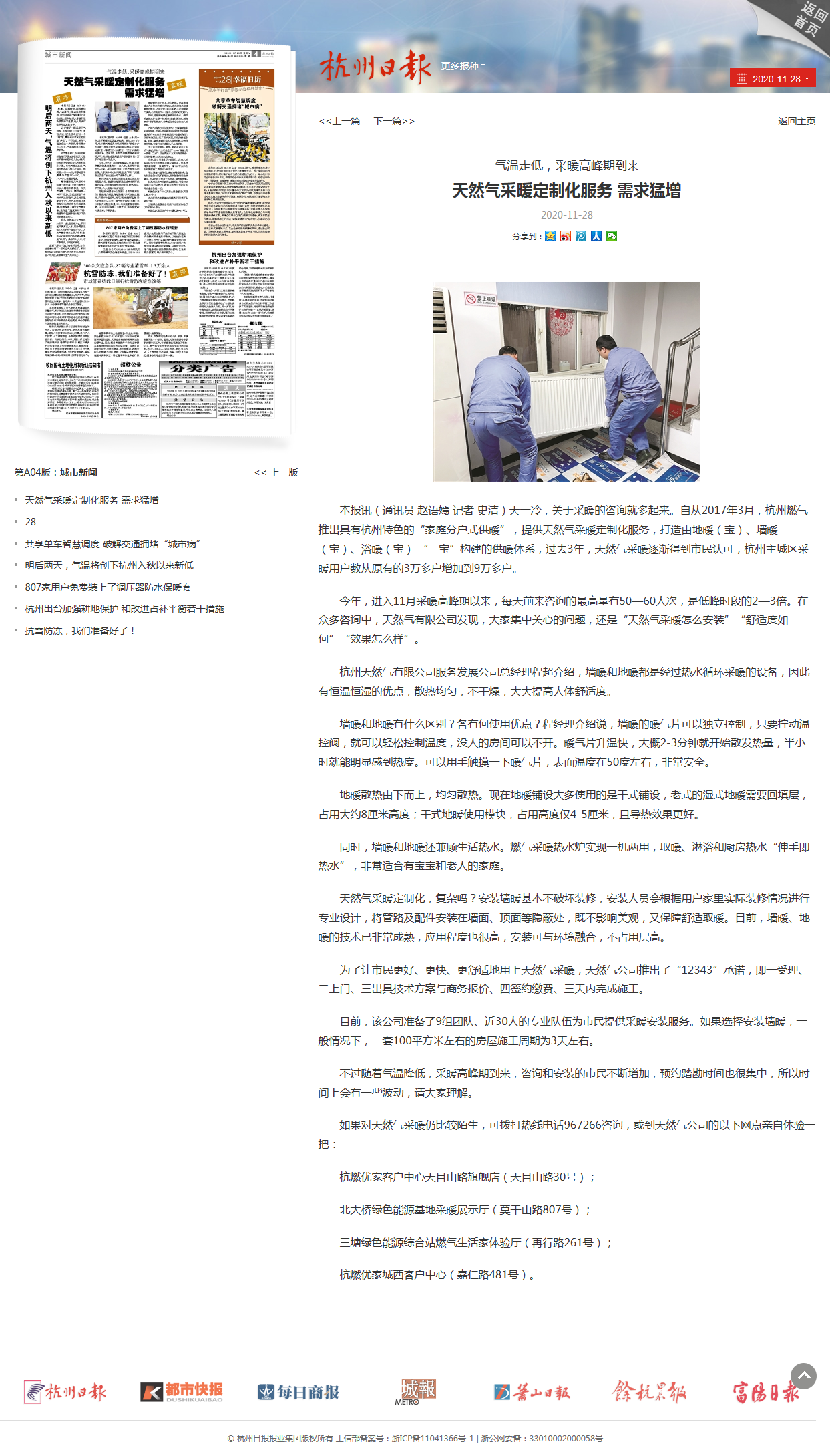 本报讯(通讯员 赵语嫣 记者 史洁)天一冷,关于采暖的咨询就多起来。自从2017年3月,杭州燃气推出具有杭州特色的“家庭分户式供暖”,提供天然气采暖定制化服务,打造由地暖(宝)、墙暖(宝)、浴暖(宝) “三宝”构建的供暖体系,过去3年,天然气采暖逐渐得到市民认可,杭州主城区采暖用户数从原有的3万多户增加到9万多户。