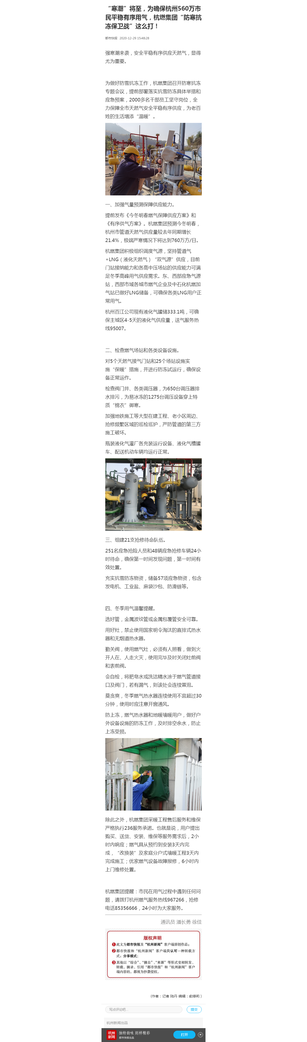 对5个天然气接气门站和25个场站设施实施“保暖”措施,并进行防冻试运行,确保设备正常运作。