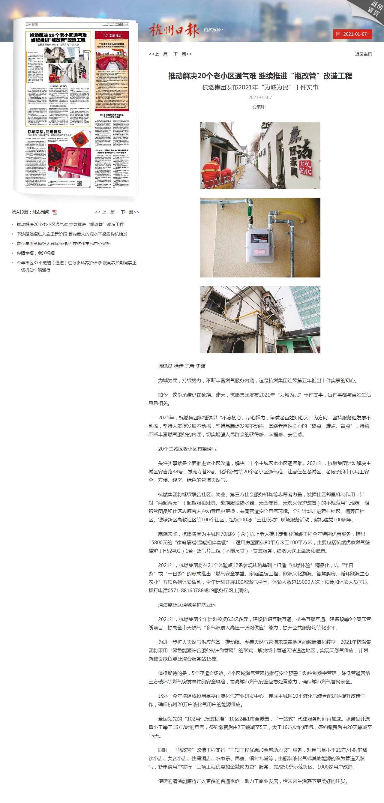 头件实事就是全面推进老小区改造,解决二十个主城区老小区通气难。2021年,电竞博彩网 计划解决主城区安吉路38号、觉苑寺巷8号、化纤新村等20个老小区通气难,让居住在老城区、老房子的市民用上安全、方便、经济、绿色的管道天然气。