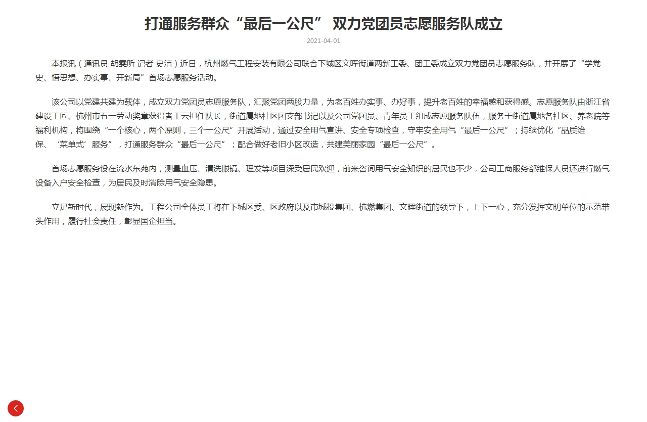 该公司以党建共建为载体,成立双力党团员志愿服务队,汇聚党团两股力量,为老百姓办实事、办好事,提升老百姓的幸福感和获得感。志愿服务队由浙江省建设工匠、杭州市五一劳动奖章获得者王云担任队长,街道属地社区团支部书记以及公司党团员、青年员工组成志愿服务队伍,服务于街道属地各社区、养老院等福利机构,将围绕“一个核心,两个原则,三个一公尺”开展活动,通过安全用气宣讲、安全专项检查,守牢安全用气“最后一公尺”;持续优化“品质维保、‘菜单式’服务”,打通服务群众“最后一公尺”;配合做好老旧小区改造,共建美丽家园“最后一公尺”。