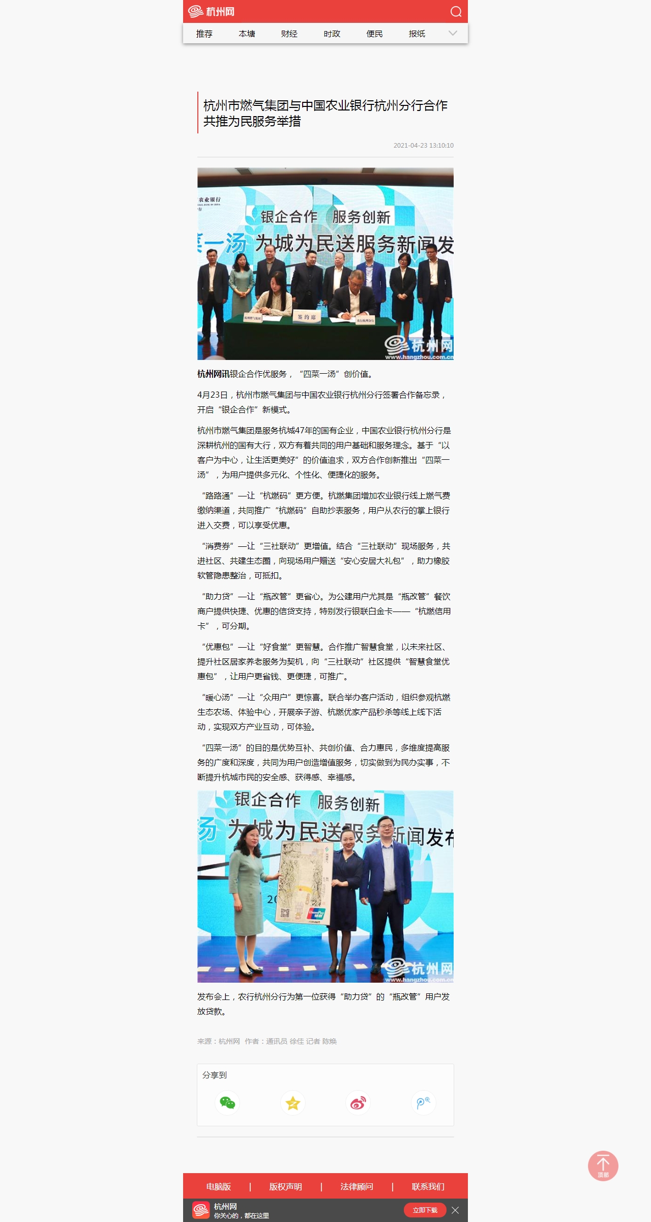 4月23日,杭州市燃气集团与中国农业银行杭州分行签署合作备忘录,开启“银企合作”新模式。