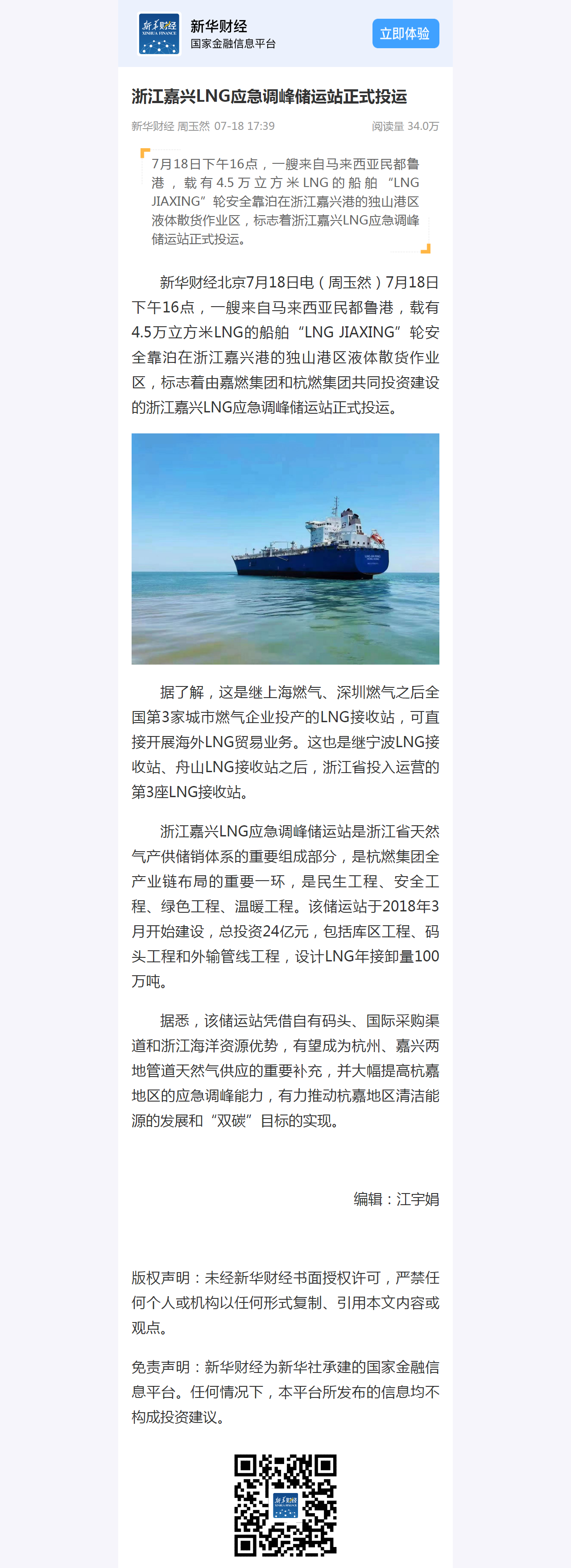 新华财经北京7月18日电(周玉然)7月18日下午16点,一艘来自马来西亚民都鲁港,载有4.5万立方米LNG的船舶“LNG JIAXING”轮安全靠泊在浙江嘉兴港的独山港区液体散货作业区,标志着由嘉燃集团和电竞博彩网 共同投资建设的浙江嘉兴LNG应急调峰储运站正式投运。