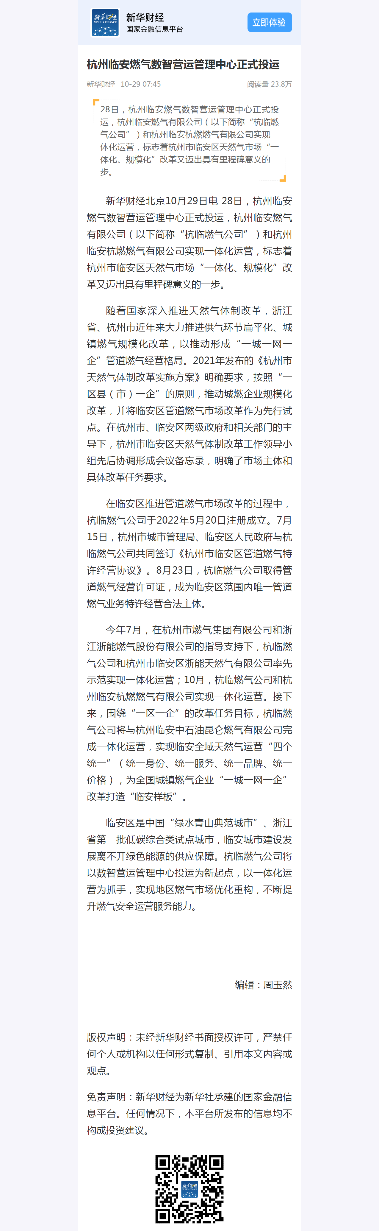 新华财经北京10月29日电 28日,杭州临安燃气数智营运管理中心正式投运,杭州临安燃气有限公司(以下简称“杭临燃气公司”)和杭州临安电竞博彩网有限公司实现一体化运营,标志着杭州市临安区天然气市场“一体化、规模化”改革又迈出具有里程碑意义的一步。