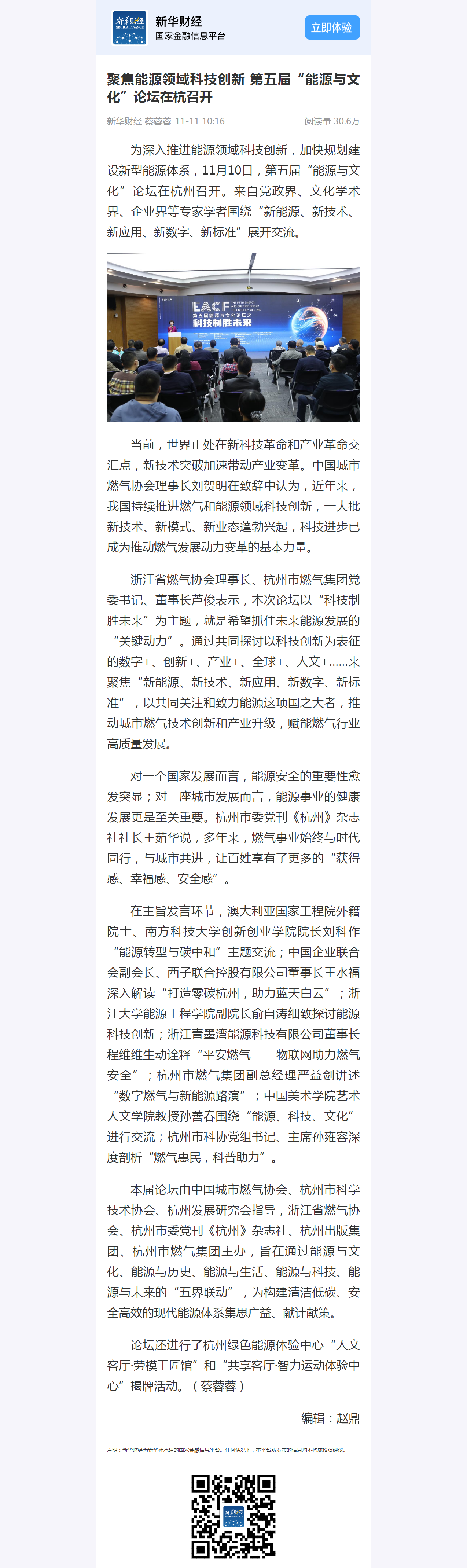 为深入推进能源领域科技创新,加快规划建设新型能源体系,11月10日,第五届“能源与文化”论坛在杭州召开。来自党政界、文化学术界、企业界等专家学者围绕“新能源、新技术、新应用、新数字、新标准”展开交流。