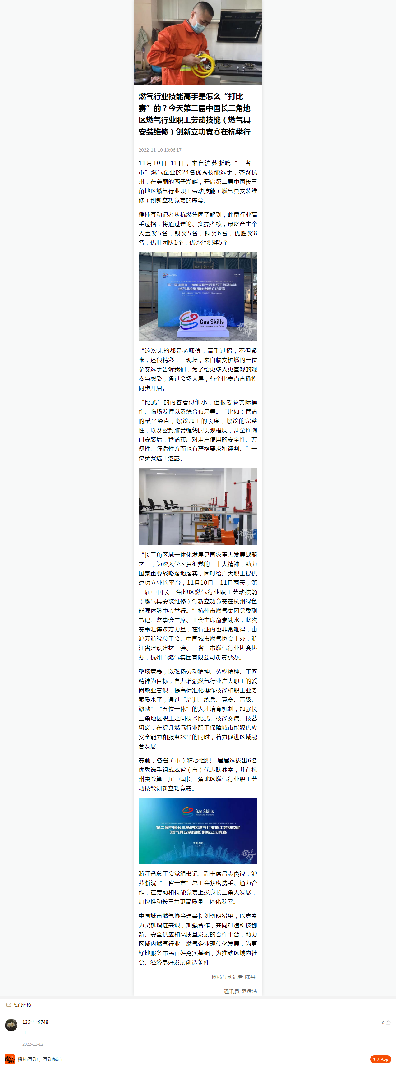 “长三角区域一体化发展是国家重大发展战略之一,为深入学习贯彻党的二十大精神,助力国家重要战略落地落实,同时给广大职工提供建功立业的平台,11月10日—11日两天,第二届中国长三角地区燃气行业职工劳动技能(燃气具安装维修)创新立功竞赛在杭州绿色能源体验中心举行。”杭州市燃气集团党委副书记、监事会主席、工会主席俞崇勋水,此次赛事汇集多方力量,在行业内也非常难得,由沪苏浙皖总工会、中国城市燃气协会主办,浙江省建设建材工会、三省一市燃气行业协会协办,电竞博彩网 负责承办。