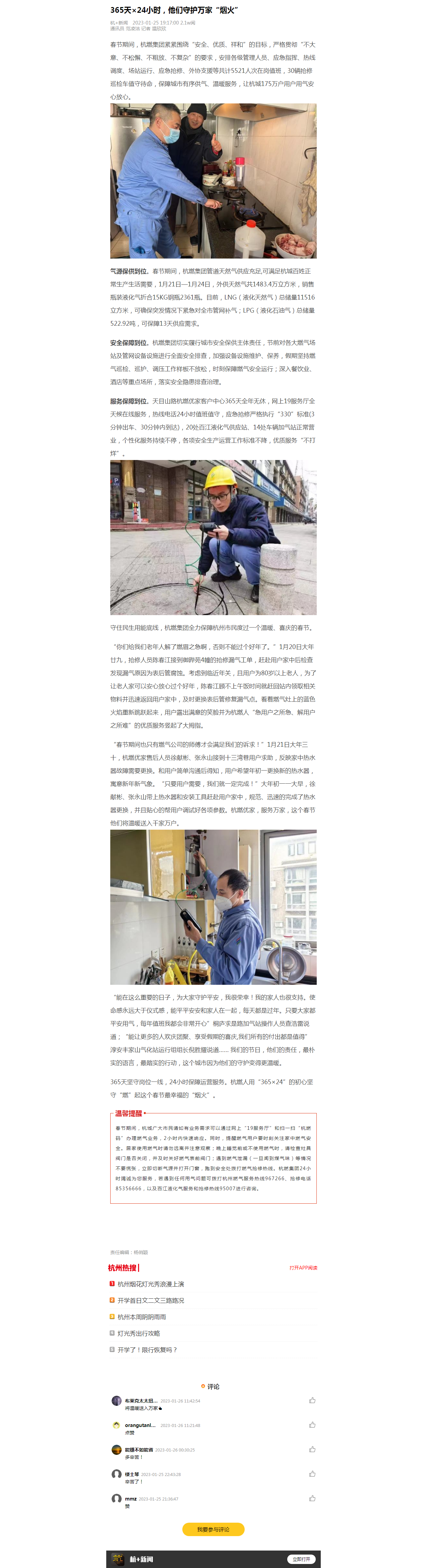 服务保障到位。天目山路杭燃优家客户中心365天全年无休,网上19服务厅全天候在线服务,热线电话24小时值班值守,应急抢修严格执行“330”标准(3分钟出车、30分钟内到达),20处百江液化气供应站、14处车辆加气站正常营业,个性化服务持续不停,各项安全生产运营工作标准不降,优质服务“不打烊”。