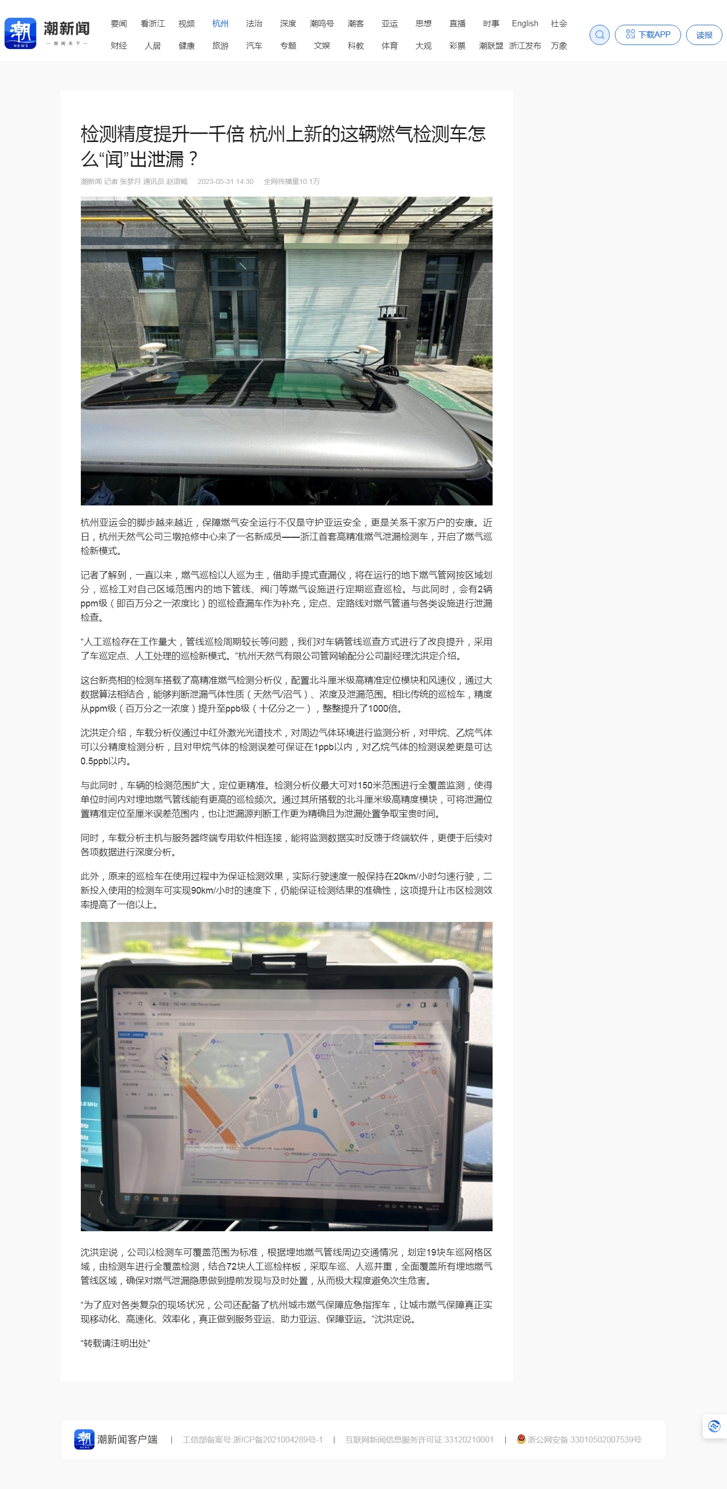 沈洪定介绍,车载分析仪通过中红外激光光谱技术,对周边气体环境进行监测分析,对甲烷、乙烷气体可以分精度检测分析,且对甲烷气体的检测误差可保证在1ppb以内,对乙烷气体的检测误差更是可达0.5ppb以内。