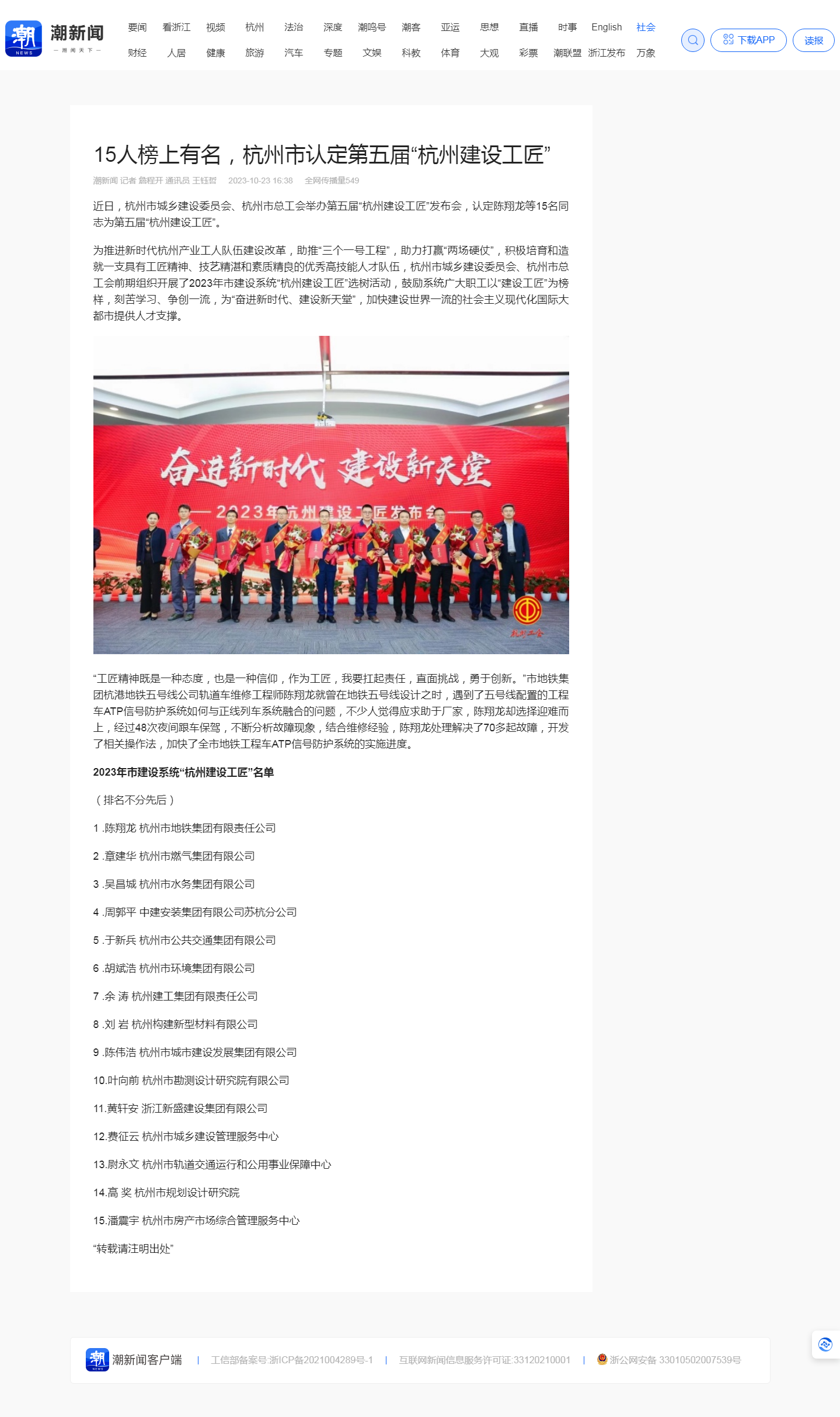 近日,杭州市城乡建设委员会、杭州市总工会举办第五届“杭州建设工匠”发布会,认定陈翔龙等15名同志为第五届“杭州建设工匠”。