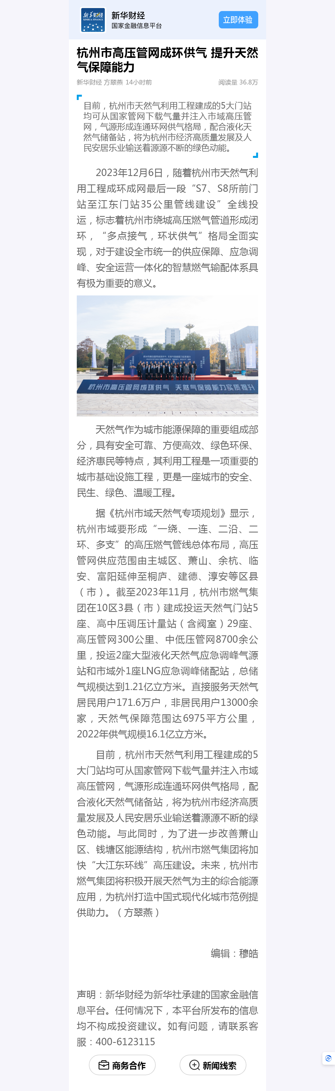 2023年12月6日,随着杭州市天然气利用工程成环成网最后一段“S7、S8所前门站至江东门站35公里管线建设”全线投运,标志着杭州市绕城高压燃气管道形成闭环,“多点接气,环状供气”格局全面实现,对于建设全市统一的供应保障、应急调峰、安全运营一体化的智慧燃气输配体系具有极为重要的意义。