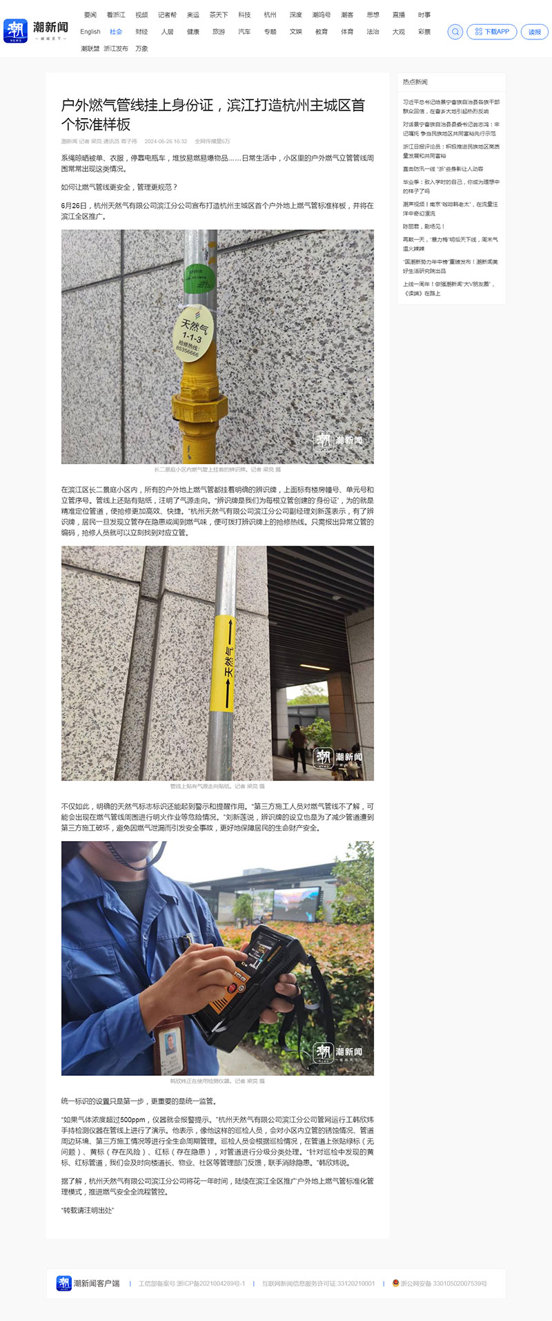 在滨江区长二景庭小区内,所有的户外地上燃气管都挂着明确的辨识牌,上面标有楼房幢号、单元号和立管序号。管线上还贴有贴纸,注明了气源走向。“辨识牌是我们为每根立管创建的‘身份证’,为的就是精准定位管道,使抢修更加高效、快捷。”杭州天然气有限公司滨江分公司副经理刘新莲表示,有了辨识牌,居民一旦发现立管存在隐患或闻到燃气味,便可拨打辨识牌上的抢修热线。只需报出异常立管的编码,抢修人员就可以立刻找到对应立管。