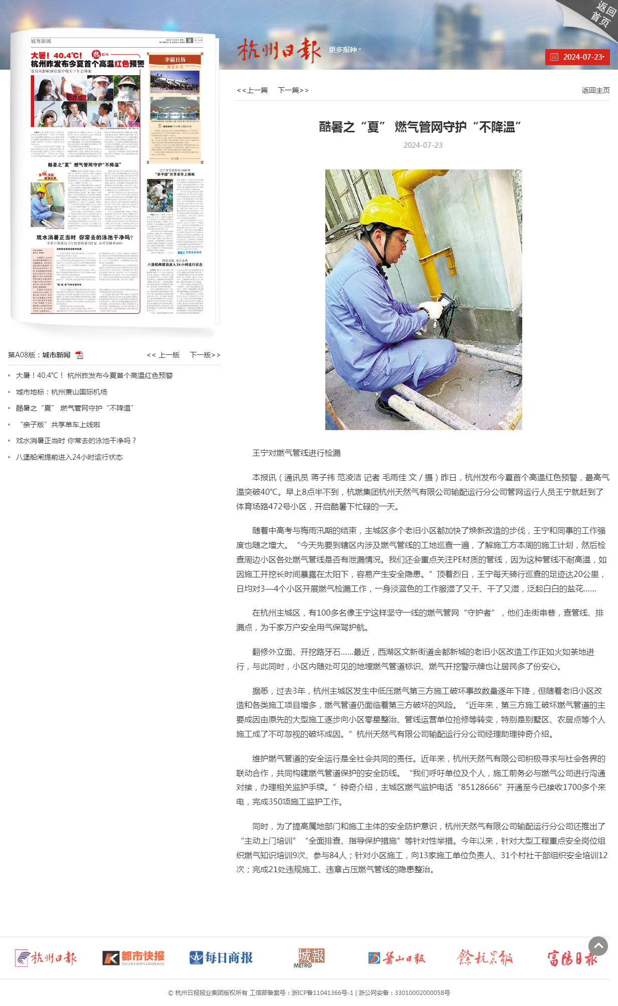 本报讯(通讯员 蒋子祎 范凌洁 记者 毛雨佳 文/摄)昨日,杭州发布今夏首个高温红色预警,最高气温突破40℃。早上8点半不到,电竞博彩网 杭州天然气有限公司输配运行分公司管网运行人员王宁就赶到了体育场路472号小区,开启酷暑下忙碌的一天。