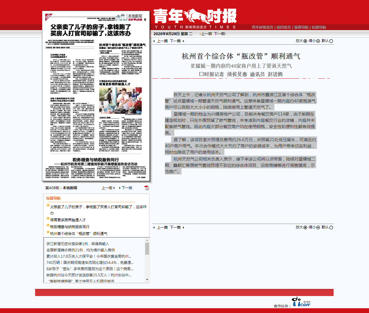 昨天上午,记者从杭州天然气公司了解到,杭州市暨滨江区首个综合体“瓶改管”试点星耀城一期管道天然气顺利通气。这意味着星耀城一期内庭约40家瓶装气商户可以告别大大小小的钢瓶,陆续使用上管道天然气了。