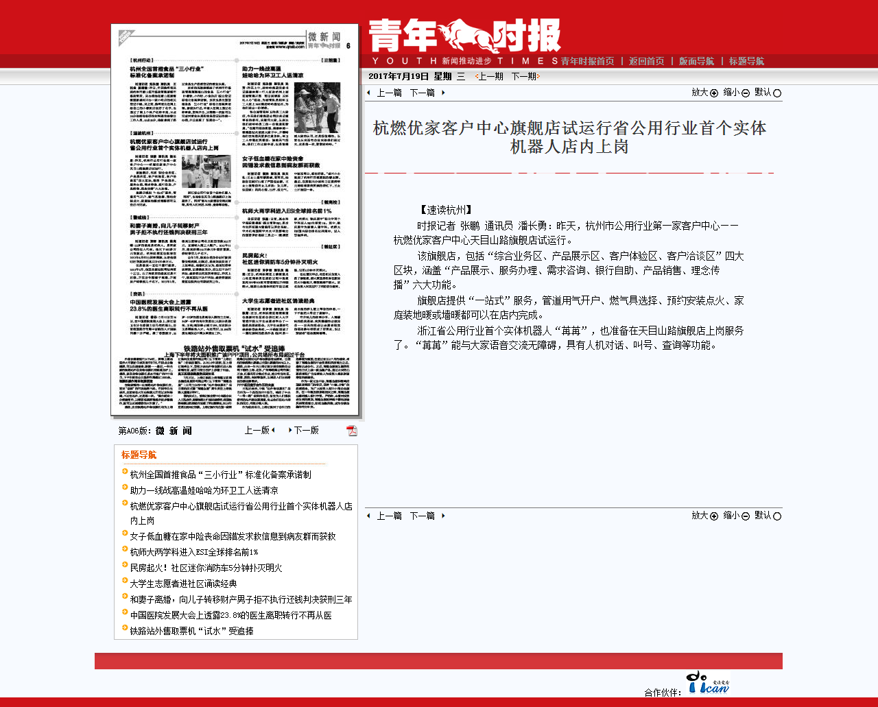 浙江省公用行业首个实体机器人“苒苒”,也准备在天目山路旗舰店上岗服务了。“苒苒”能与大家语音交流无障碍,具有人机对话、叫号、查询等功能。