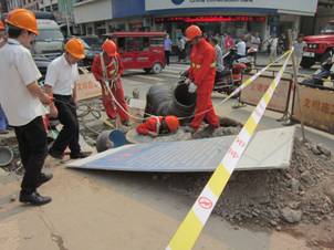 演练设定因挖掘机野蛮施工,导致燃气管网破损,造成燃气泄漏事故并有人员受伤。上午9点整,建德杭燃公司抢修热线电话接到报警,称寿昌中山路与东昌路交叉口疑似燃气泄漏。巡检人员立即赶赴现场,经确认为燃气泄漏,第一时间逐级上报,启动应急预案,成立应急指挥部,并分组赶赴现场增援。所有公司人员及工程公司西域项目部抢修班在现场指挥的精心组织下,紧张有序地开展了关闭控制阀门、警戒疏散群众、抢救伤员、防护作业、抢险抢修、修复破损管道、置换通气、用户服务等演练。