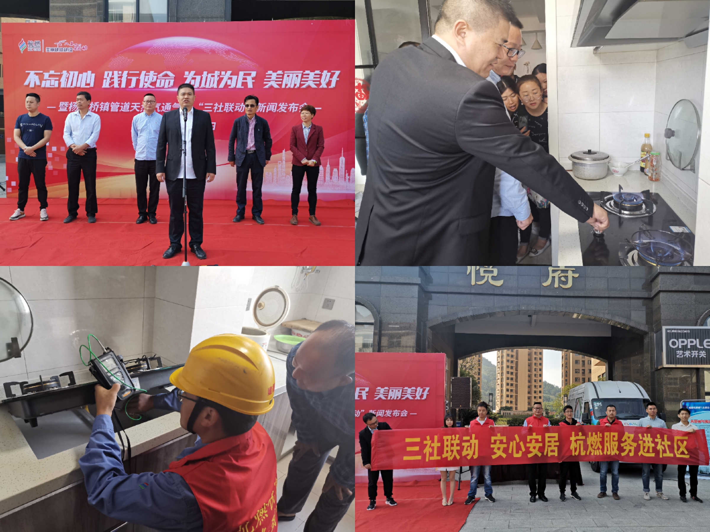 另外,为深入学习贯彻习近平新时代中国特色社会主义思想,全面落实省委《关于加强新时代城市基层党建工作的意见》,切实巩固党的执政基础,按照“共享资源、共同服务、共谋发展、共创和谐”的目标要求。发布会上杨村桥村周书记、华宇置发业蒋总、建德杭燃方总,三方代表以为城为民、公益同行为己任,完成“三社联动”共建结对签约仪式。通过三社联动,减少燃气安全隐患,推进燃气“安全隐患零社区”,打造安全、安心、安居的绿色社区。