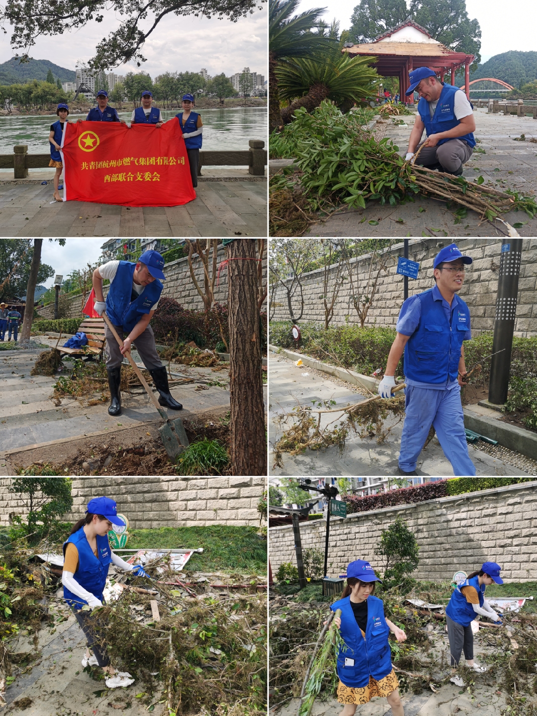在清理现场,公司青年不畏高温,就地竖起团旗,发扬雷厉风行的“杭燃铁军”精神,穿上雨靴,带上手套,拿着扫把、铁锹,认真清扫垃圾,并用麻绳将枯枝烂叶捆绑整齐配合环卫工人清运。汗水湿透了每一个人的衣裳。许多的树枝又大又重又脏,面对这些,团员志愿者们没有人嫌脏,徒手就搬,说干就干。经过一个下午的通力合作,江滨公园路面现已基本恢复清洁。