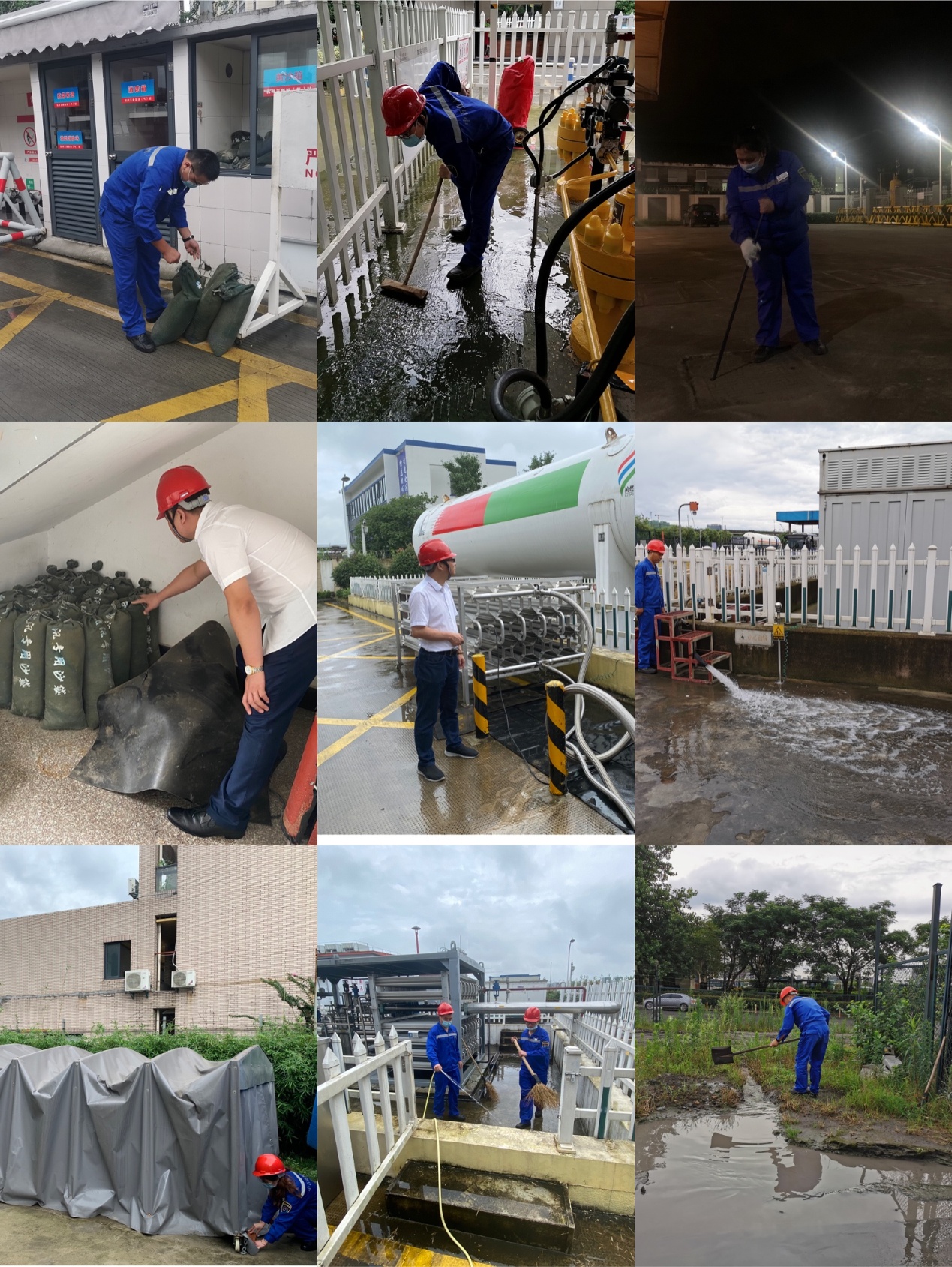 领导班子兵分几路,多次连夜赶往各站点,一是对所有站点的沙袋、草袋等防汛抗洪物资进行了再排查,确保物资充足。二是对各站点开展检查,特别是对排水系统、重点要害部位进行排查,同时要求对LNG站的积液池进行排水使池内水位降至最低点,保证工艺区内设备安全运行;对室外加气机进行防护,以免电器件淋雨无法使用;对压缩机进行防雨布固定等,用各种措施进行防范。公司实行领导班子、管理骨干和站长带班在岗24小时值守,掌握站点的现场情况。同时,由各站长对本站的防汛工作进行每班汇报,并叮嘱全体员工在汛期一定要提高防范意识,确保场站各类设备设施安全度汛,同时提醒员工在上下班途中也要注意人身安全。