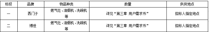 2.1 招标范围:目前房产项目需要的燃气灶、油烟机、洗碗机等厨具用品及安装服务,共划分为两个标段;